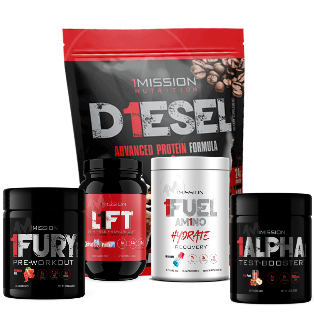 Want to put on size? Want to maximize your strength? Then this is the stack for you! We start by hooking you up with 2 fantastic pre-workouts – Start with 1FURY to help you kick off your workout like never before. While being designed to massively boost energy, focus, and power we also made sure that every single ingredient in 1FURY also ignites fat loss! For your night workouts, we have added in the stimulant-free massive pumps and power of our Ultra Dosed L1FT Preworkout. L1FT is a true heavy hitter when it comes to adding power, pumps, and muscle growth to your workouts. Ignite the recovery process and anabolic muscle growth with 1FUEL, our patented recovery formula to feed your muscles and provide fuel for them to grow. Next, you get our patented D1ESEL protein to ensure that you are feeding your muscles correctly after every workout and that your body gets the maximum benefit from all of that hard work! You also get the thermogenic burn of our best-selling 1FIRE FAT BURNER to help keep you shredded and show off that hard-earned muscle. 1ALPHA finishes out this stack and is designed to massively boost your natural Testosterone Levels. This can create increased stamina, strength, and overall improved body composition. Try it today to amplify your results in the gym like never before!